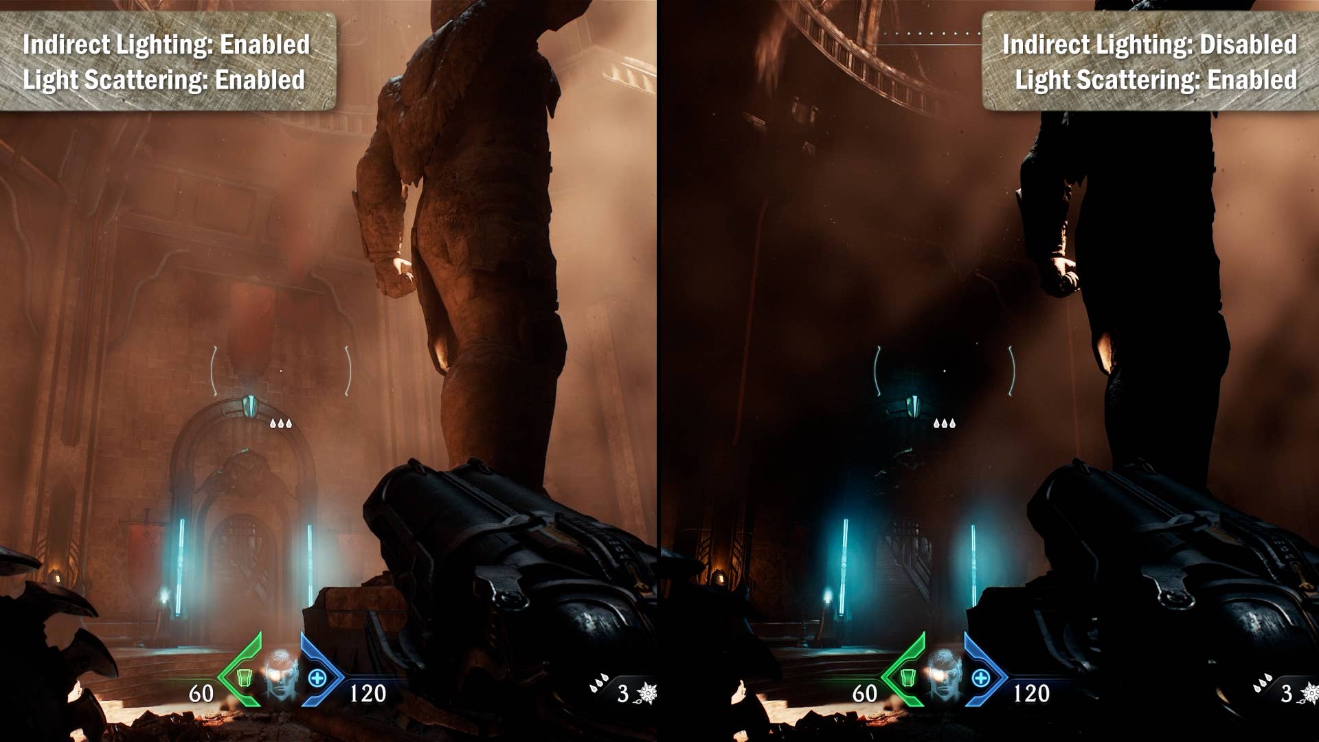 While on the subject of lighting and shadow, Doom: The Dark Ages also makes use of two other depth enhancing features – SSDO for ambient occlusion and parallax occlusion mapping. Both of these increase surface depth and complexity. While the RTGI solution is very effective, it still has precision limitations which necessitate the use of a screen-space solution but SSDO in this case is used both in direct and indirect situations with shadows applied in the correct direction per local light sources making it far more effective overall.