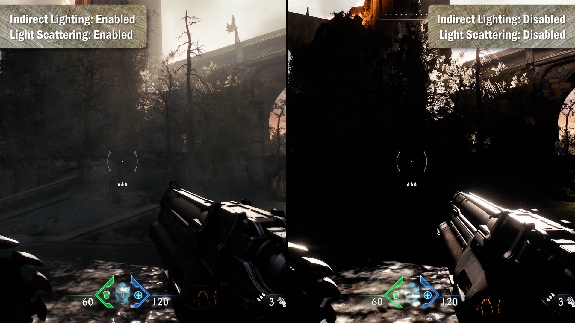 When coupling this with the atmospheric effects, fog volumes and weather, I’d say that id Software achieved its goal. The very first stage takes place during a rainstorm and everything works in tandem to create something that feels unbelievably intense and beautiful. Of course, this needed to extend across the entire environment, so id also introduced a new water surface simulation which allows proper ripples and reactions in bodies of water. I’m a sucker for effects like this – it’s nothing new but it’s always wonderful to see.