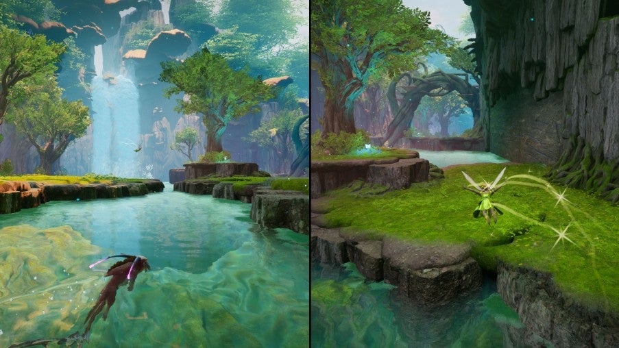 Meanwhile, over on the fantasy side of things, I gambled along on the back of a dragon which had the ability to roll up into a tight ball to push heavy objects – essentially like a Goron from The Legend of Zelda. I also shapeshifted into a tiny fairy who could chain jump through a luscious woodland glade, as well as a towering Ent-like tree creature which could extend its arms to grab onto far off edges. It was all suitably enchanting.